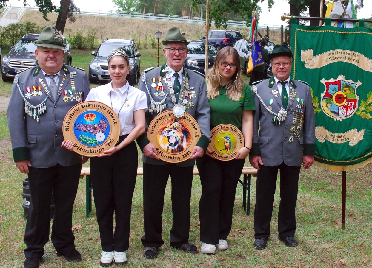 „Mit 35 Jahren zählt unser Schützenverein zu den Jungspunden unter den Gilden angesichts von Gründungsjahren wie 1718, 1719, 1802 usw., jedoch sind wir stolz auf das was da in den Turbulenzen der großen Wende 1990 in Gedanken keimte, reifte und dann am 30. Juli 1990 Wirklichkeit wurde: die Gründung einer neuen Vereinigung, die das sportliche Erbe der einstigen Gesellschaft für Sport und Technik, der GST, fortsetzen sollte, und mit anderen Farben, Formen und Möglichkeiten dem Schießsport ein neues Aussehen und eine neue Tradition geben wollte.“, so begrüßte Zeremonienmeister Lars Mattusch am vergangenen Samstag die Gäste und Gildemitglieder beim traditionellen Schützenfest der Rückersdorfer Schützengilde 1990 e.V. Am 30. Juli 1990 fanden sich 19 Männer zusammen, um die Rückersdorfer Schützengilde zu gründen. Heute sind noch die vier Gründungsmitglieder Günther Schimko, Lothar Belger, Rainer Weber und der amtierende Vorsitzende Thomas Hustan in der Gilde aktiv. „Danke für die Treue zur Mitgliedschaft, Danke für die Mitarbeit, und weiterhin ein gutes Miteinander im und für den Verein.“, so Mattusch in seiner kleinen Begrüßungsrede. „Schützenvereine wie wir halten den Schießsport und die Traditionen aufrecht und die Gilden die uns nahestehen, also Euch, haben wir heute hierher eingeladen“. Dieser Einladung waren auch in diesem Jahr wieder Abordnungen der befreundeten Schützengilden aus Doberlug, Kirchhain, Döllingen, Uebigau, Bad Liebenwerda und Finsterwalde nach Rückersdorf gefolgt. Als Höhepunkt erfolgte dann die Proklamation des neuen Königshauses, welches am Vorabend beim traditionellen Königsschießen ermittelt wurde. Neuer Schützenkönig ist das langjährige Mitglied Werner Merten. Ihm zur Seite steht die neue Königin Alina Polster. Hier ein Novum in der Geschichte der Gilde, Alina ist erst seit zwei Monaten neues Mitglied und hat sich gleich die Königskrone erkämpft. Was aber wohl in der Familie liegt, denn auch Schwester Astrid, Bruder Axel oder Opa Günther sind erfolgreiche Schützen. Die neue Jugendkönigin Leonie Hustan folgt auch der Familientradition von Familie Hustan. Das Königshaus wird komplettiert vom ersten Ritter Rainer Rindt und dem zweiten Ritter Norbert Meißner. Auch Georg Zörner, Bürgermeister der Gemeinde, nutzen die Gelegenheit, um der Gilde zum Jubiläum zu gratulieren. Er dankte den Gildemitgliedern für die langjährige Treue und die immer gute Zusammenarbeit mit der Gemeinde. Auch von Seiten der Gemeinde wird viel unternommen, die Arbeiten und Tradition in der Gilde zu unterstützen. So konnte beispielsweise die Gemeinde im vergangenen Jahr den Anschluss an das Abwasser gemeinsam mit der Gilde realisieren. Nach dem offiziellen Teil war Zeit für ein gemütliches Beisammensein mit allen Gästen und Besuchern. Alle Gäste und Besucher hatten auch wieder die Möglichkeit bei einer Tombola und dem Preisschießen mit dem KK-Gewehr großartige Sachpreise zu erkämpfen. Der Hautpreis beim Preisschießen ging mit 46 Ringen an Frank Kostroa. Platz zwei und drei mussten, nicht zum ersten Mal, im Familienduell Fröhn entschieden werden. Nach dem offiziellen Schießen lagen Vater Mike-Steffen und Sohn Florian mit 45 Ringen gleich auf. Nach dem Stechen ging Platz zwei an Vater Mike-Steffen gefolgt von Florian Fröhn. Sponsorenkönig wurde die Gemeinde Rückersdorf, vertreten durch Bürgermeister Georg Zörner.